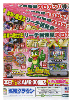 今回の新台で入る台のロゴやイラストを、にぎやかに明るくデザインしました。各台がハッキリ目立つインパクトのある、片面折込チラシ。